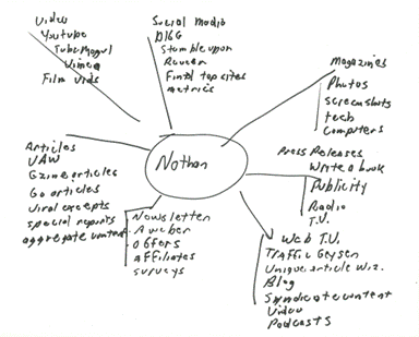 A mind map is one of the fastest ways of coming up with new ideas. You place your name in the center and circle it, then let your mind come up with all sorts of ideas represented by the lines radiating out. The main heading for each idea is at the top of each arm. From there, you can list other ideas as they flash into your mind. The process takes only minutes.